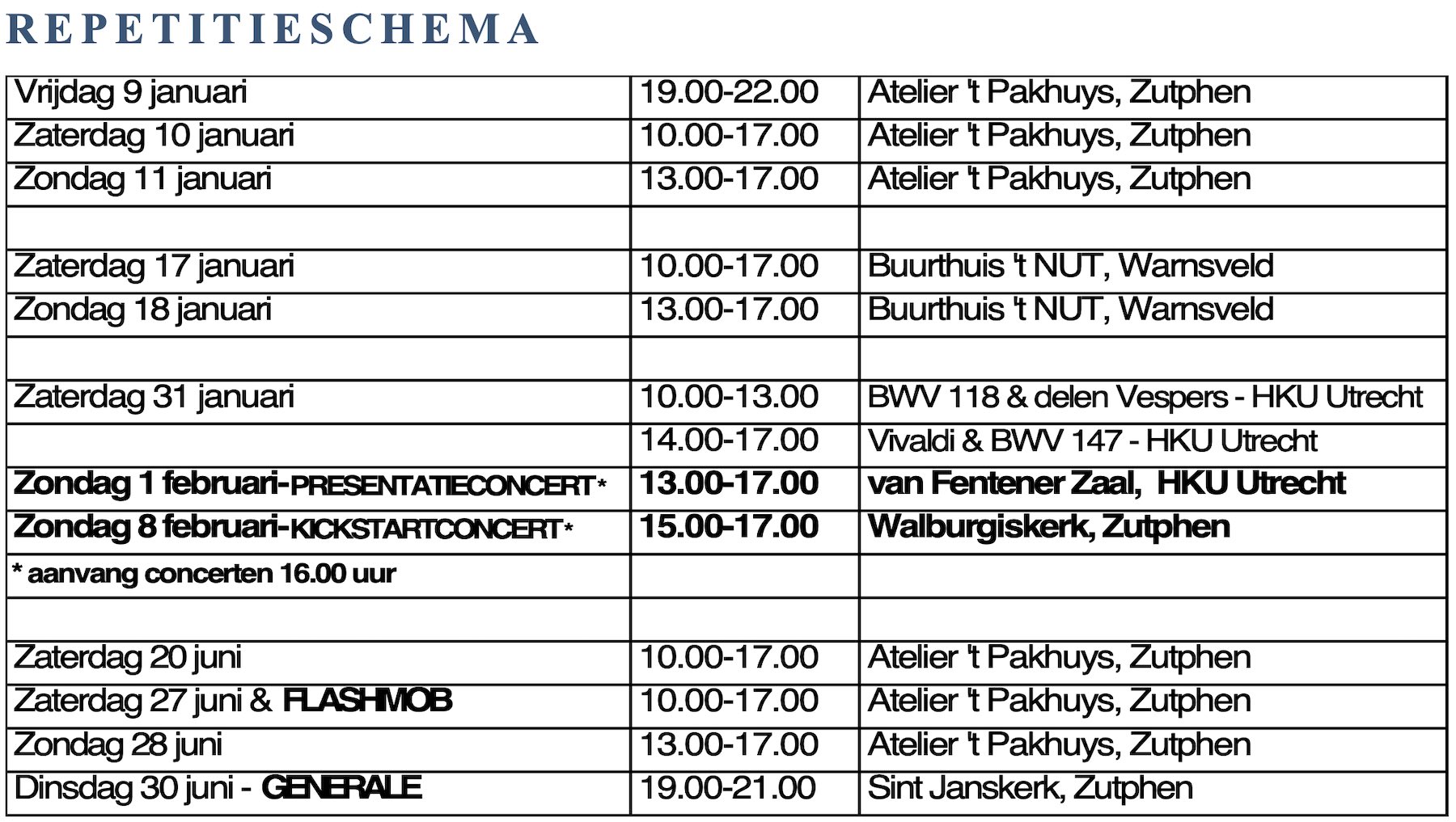 Houd er rekening mee dat je ongeveer 2 à 3 uur vóór elk concert aanwezig moet zijn voor de aanspeelrepetities. Koortenue is zwart.