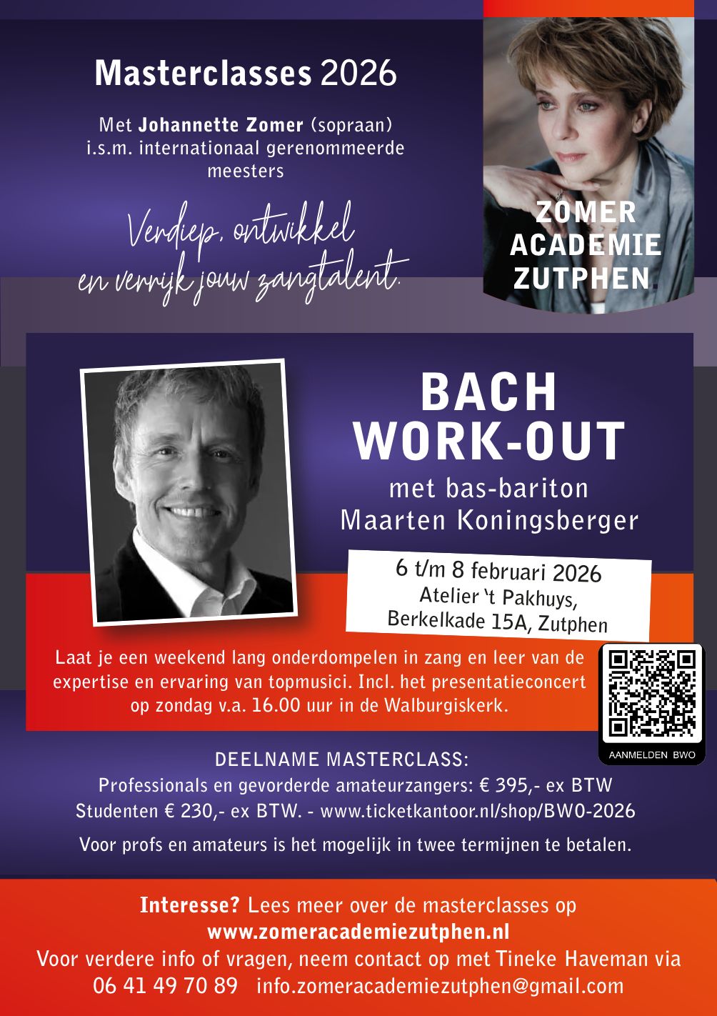 Kom een weekend lang je zangtalent verdiepen, ontwikkelen en verrijken bij de komende BACH WORK OUT van de Zomer Academie Zutphen, met deze keer bas-bariton Maarten Koningsberger als extra coach.